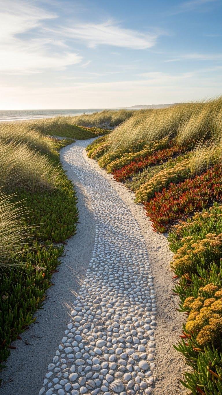 Plant salt-tolerant grasses and succulents to soften edges, letting pathways breathe and invite wander.