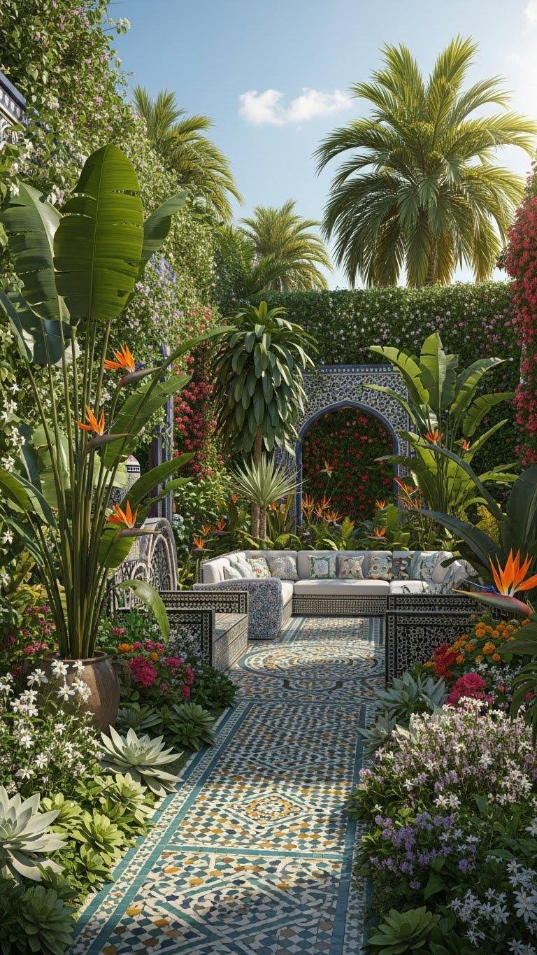 From those shimmering bands and petal echoes, steer your eye toward bolder palettes and layered textures: Tropical and Moroccan motif garden zones will let you pair lush, oversized foliage with geometric tilework and fragrant, sun-loving plantings.
