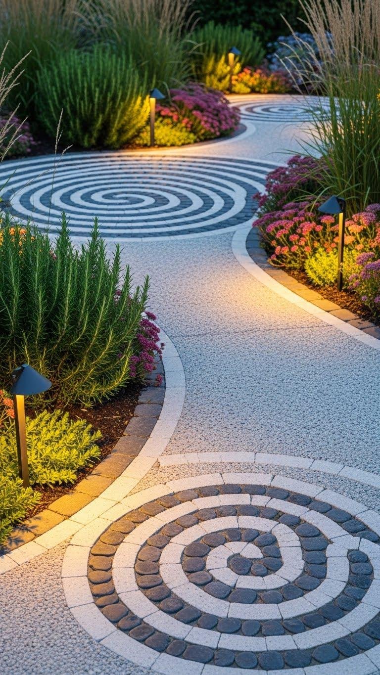 You’ll place pebbles to guide movement, use contrasting grout to define whorls, and weave low spiral lighting for dusk atmosphere.