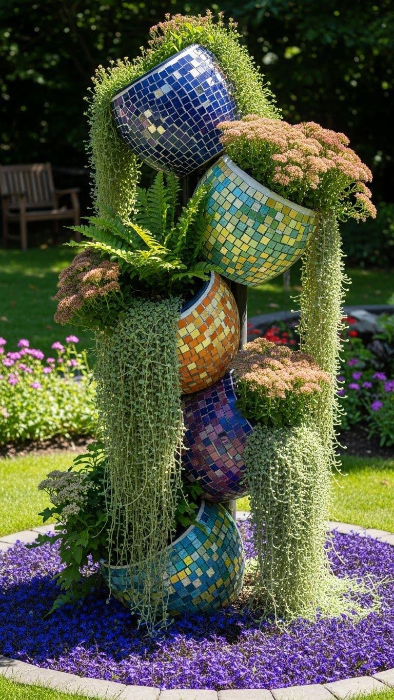 [IMAGE PROMPT: A vibrant garden scene featuring coordinated mosaic planters and pots in various colors, textures, and forms. The planters are grouped by color coordination, showcasing a mix of repeating glaze tones and pebble textures. Heights of the pots are varied to highlight different foliage and blooms. Lightweight pots with visible drainage solutions are displayed. The arrangement includes herbs, trailing vines, and sculptural succulents, creating a cohesive and liberated planting statement.]