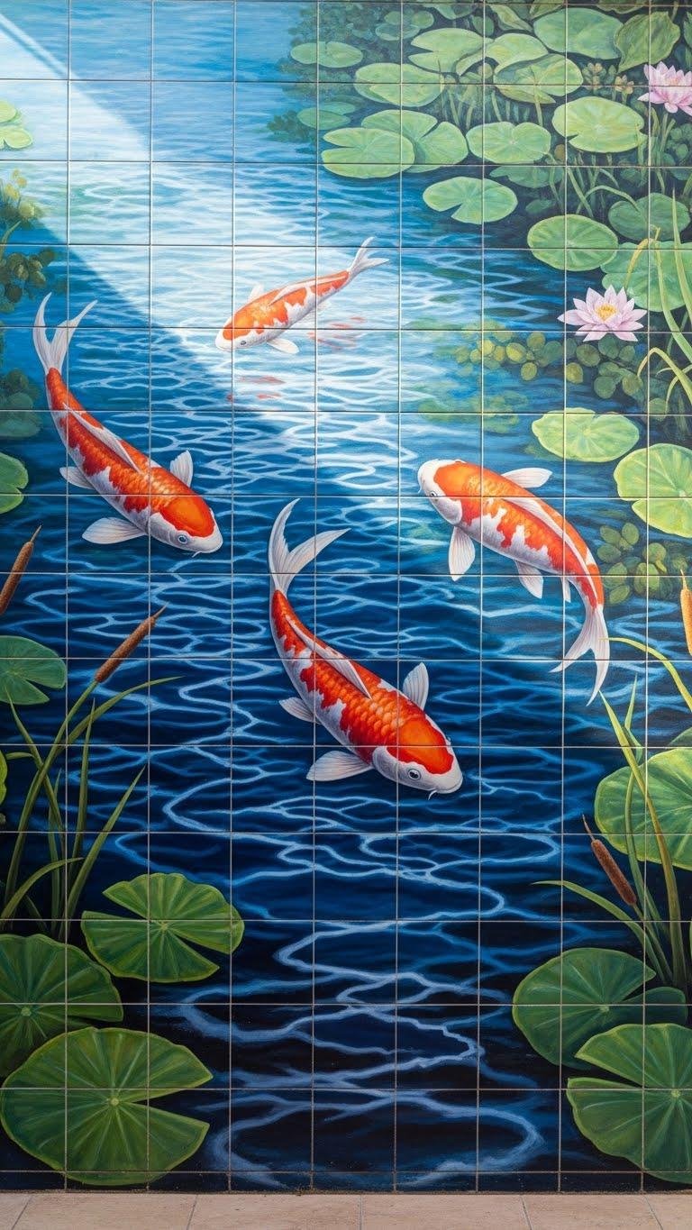 When you edge a real pond or tile a courtyard wall with painted tiles, a trompe d’œil koi mural turns water and plants into a staged performance—vivid fish seem to glide beneath rippling reflections while lily pads and rushes appear to press against ceramic edges.