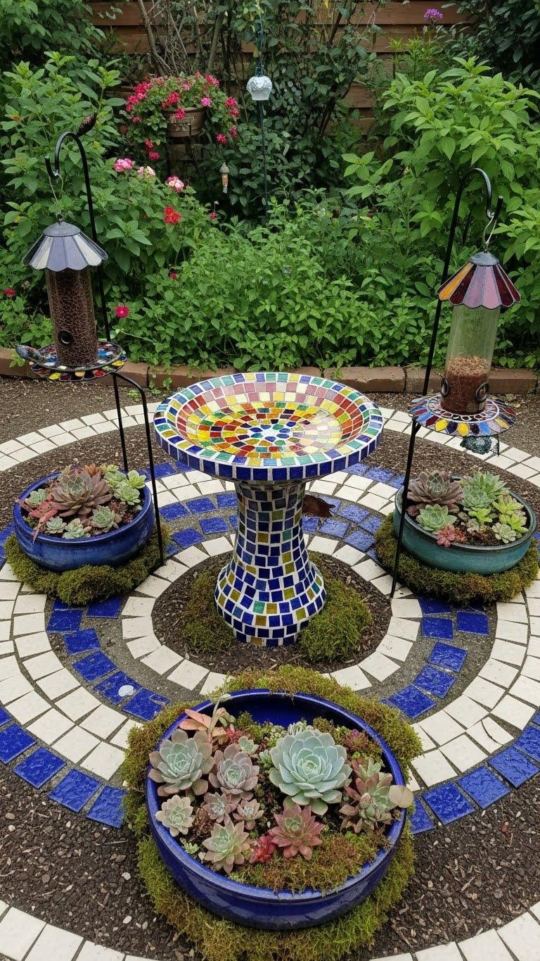 Often you’ll find that a mosaic birdbath becomes the garden’s hummingheart, its tiles catching light like petals while inviting birds to pause.