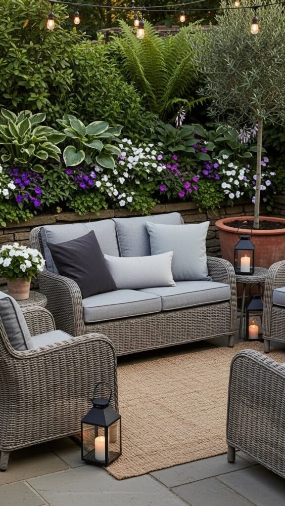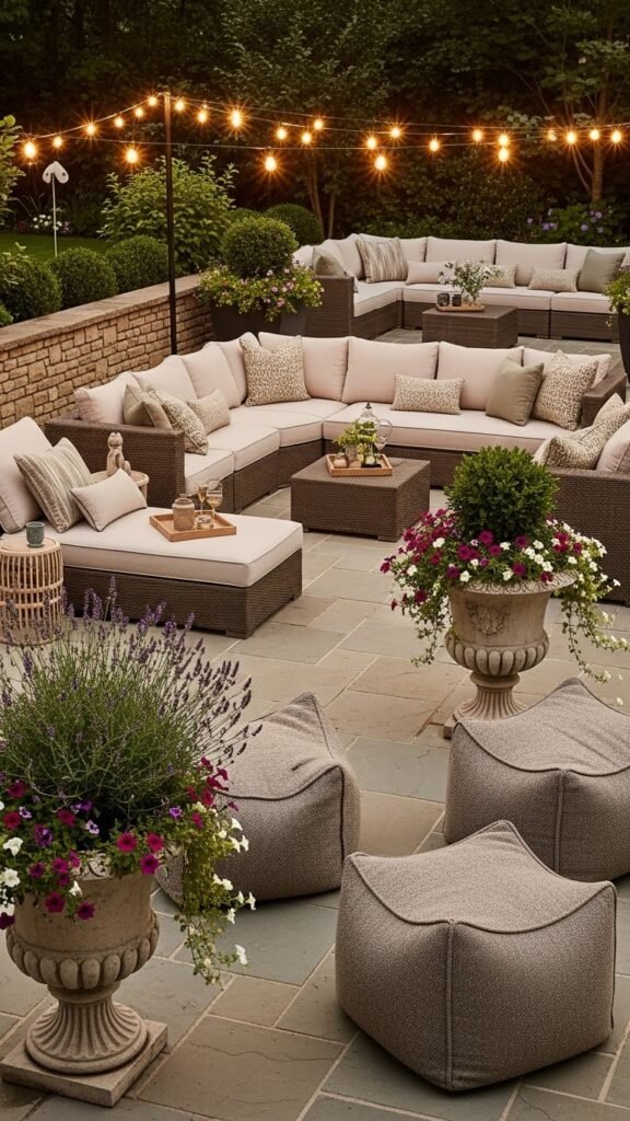 You’ll use a modular chaise and flexible ottomans to redefine paths, anchor planting pockets, and let seating adapt as evenings unfold.