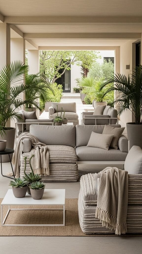 You’ll choose furniture with sleek frames and a muted palette, add textured throws and cushions, and position potted palms or succulents for softness. Keep pathways open, embrace light, and let greenery anchor the calm, freeing your outdoor room to breathe.