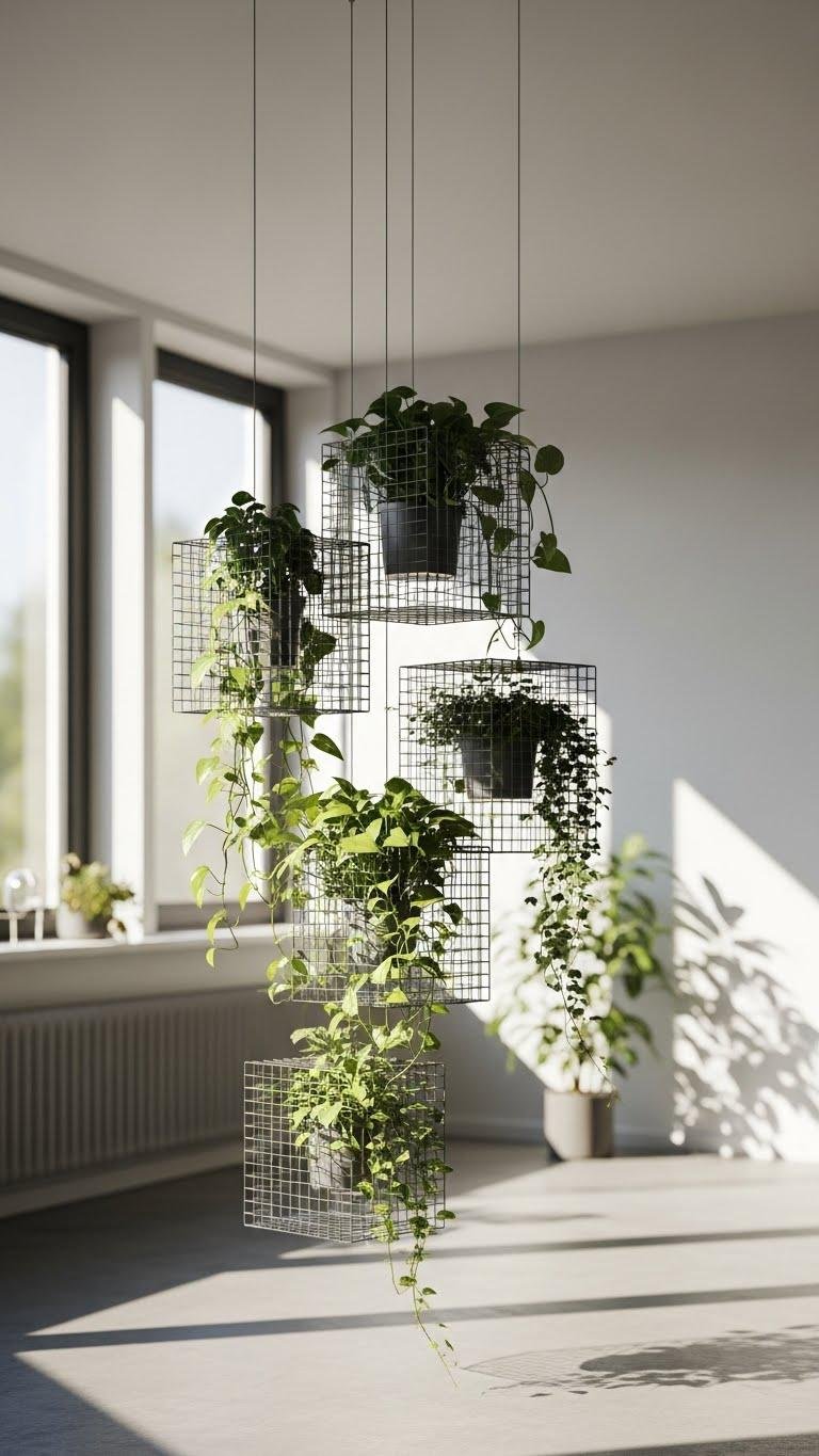 You’ll embrace floating geometry as a sculptural display: a minimalist wire grid supports pots, freeing surfaces and giving plants room to breathe.