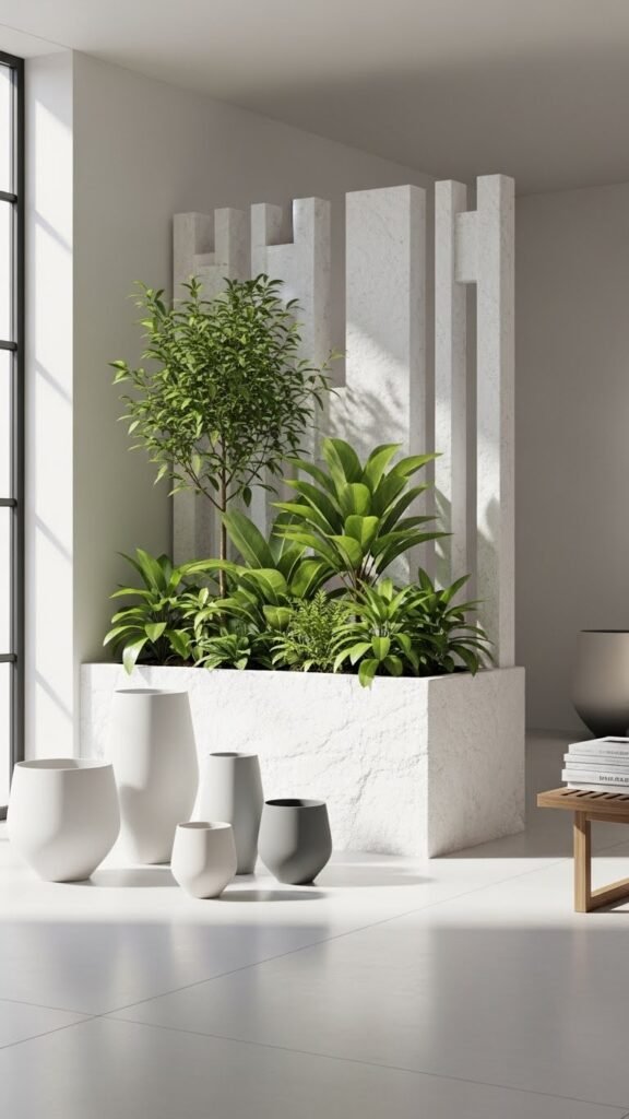 Bring calm into your space with a serene white stone base plant divider that anchors greenery in minimalist elegance. You’ll use a low-profile stone planter as a crisp foundation, creating breathable sightlines and defined zones without fences.