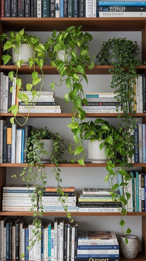 You’ll place hanging pothos and trailing ivy across a layered shelf, letting vines spill into a cozy book nook. Keep pots low-profile, stagger heights, and let movement and light shape a liberated, gallery-ready display.