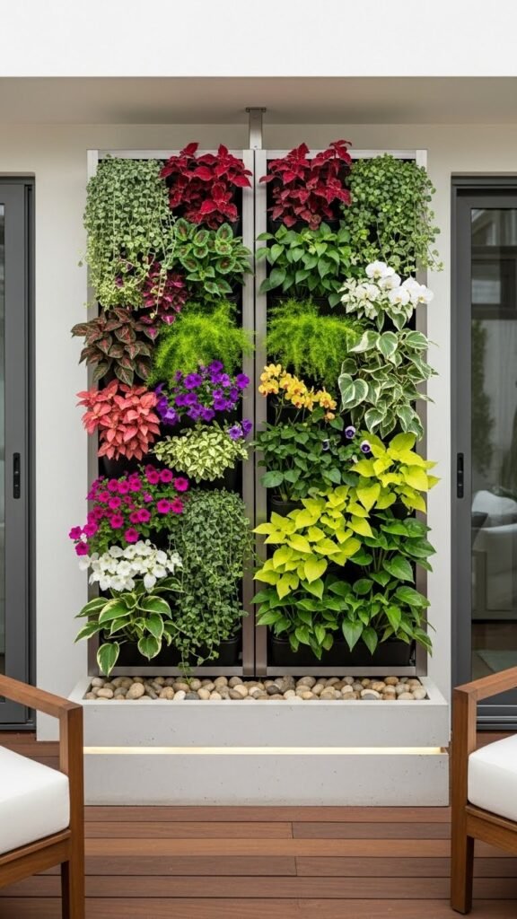 Stepping out onto your terrace, extend that green wall to frame a cozy seating nook where layered planters and vertical panels create privacy and texture without crowding the floor.