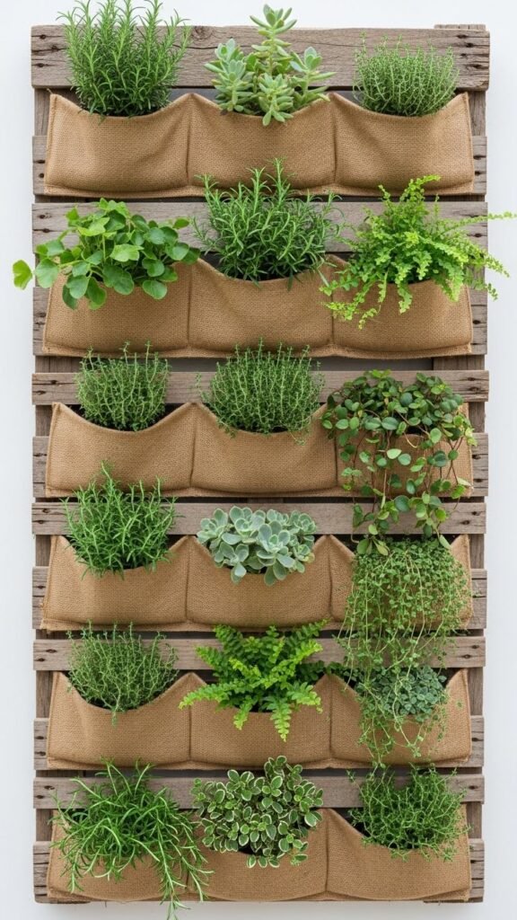 You’ll mount an upcycled pallet, secure pockets between vertical slats, and plant cascading herbs, ferns, and succulents.