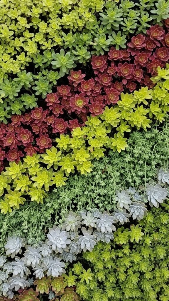 Imagine a vast, textured tapestry of succulents climbing your wall — tight rosettes, trailing sedums, and sculptural echeverias arranged to read like a living gradient.