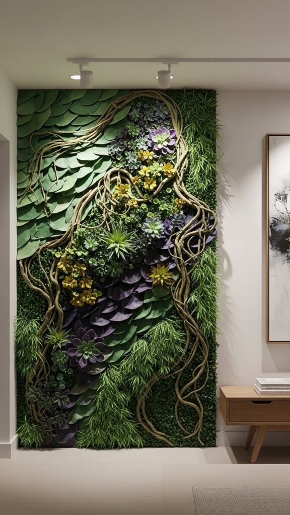 You’ll mix textured vines with pockets of synthetic succulents, vary scale and color, and position lighting to emphasize relief.
