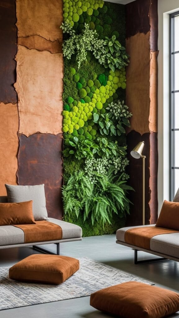 Texture anchors the room when you pair distressed leather panels with a living green wall, creating a bold contrast that feels both rugged and fresh.