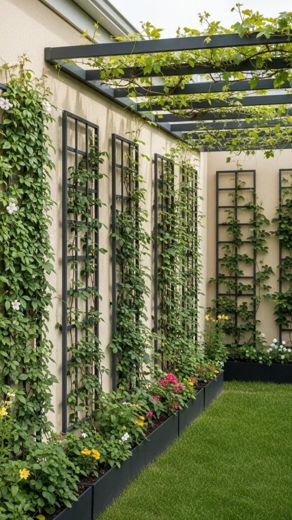 You’ll train vines into espalier sculptures along walls, or build trellis pergolas to create shaded, productive corridors. They free small yards, boost yields, and let you sculpt privacy and beauty without losing mobility or control.