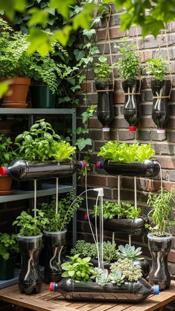 Bring old plastic and glass bottles back into service as compact, cheap planters that let you grow herbs, lettuces, and succulents in tight spaces. You cut, fill, and hang or stand them, creating a recycled terrarium vibe that conserves soil and water.