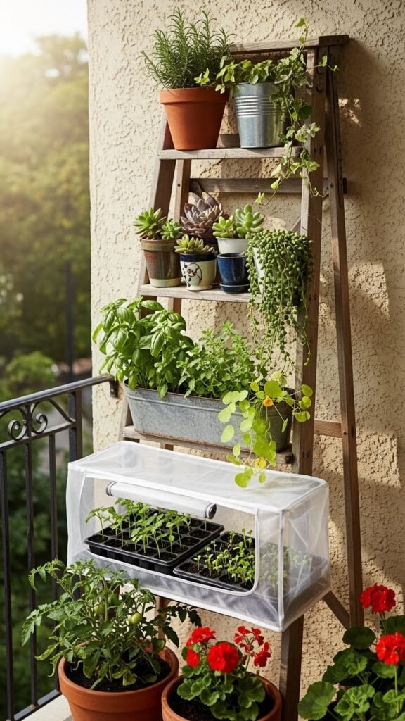You can repurpose a rustic ladder to display herbs, succulents, and climbers, secure shelves, and add a compact mini greenhouse cover for seedlings.
