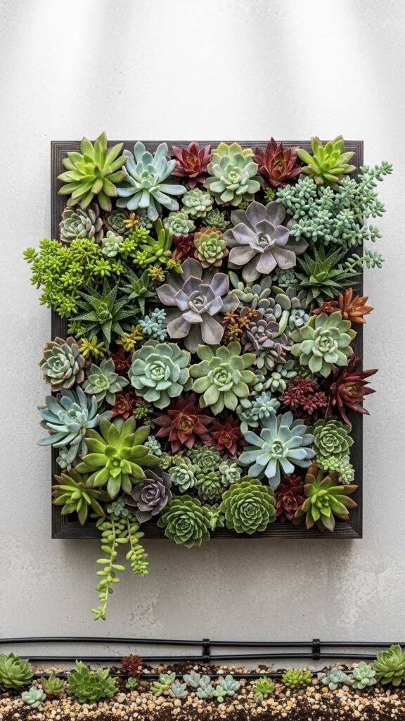 If you liked the way a bench-planter squeezes seating and growing space into a small footprint, vertical succulent frames give you even more planting area without taking up the floor.