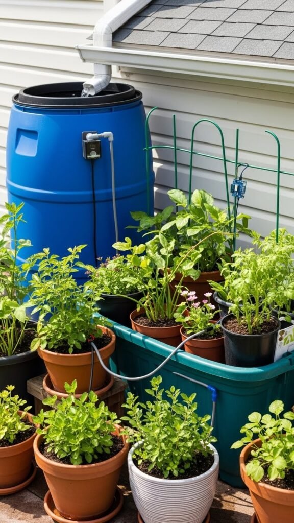 You’ll collect roof runoff in a barrel, filter debris, and gravity-feed drip lines to pots. Combine greywater reuse for nonedible plants, add microcontroller automation for timed watering, and you’ll free yourself from daily chores while conserving resources and space.