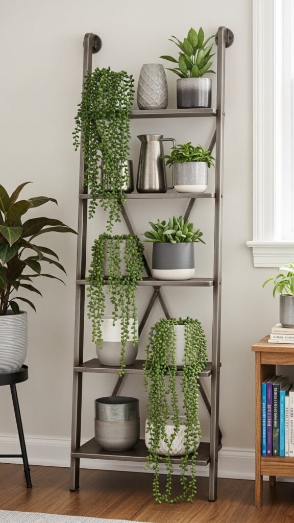 A steel ladder shelf brings sculptural storage and greenery into tight spaces, letting you stack potted plants vertically without feeling cluttered.