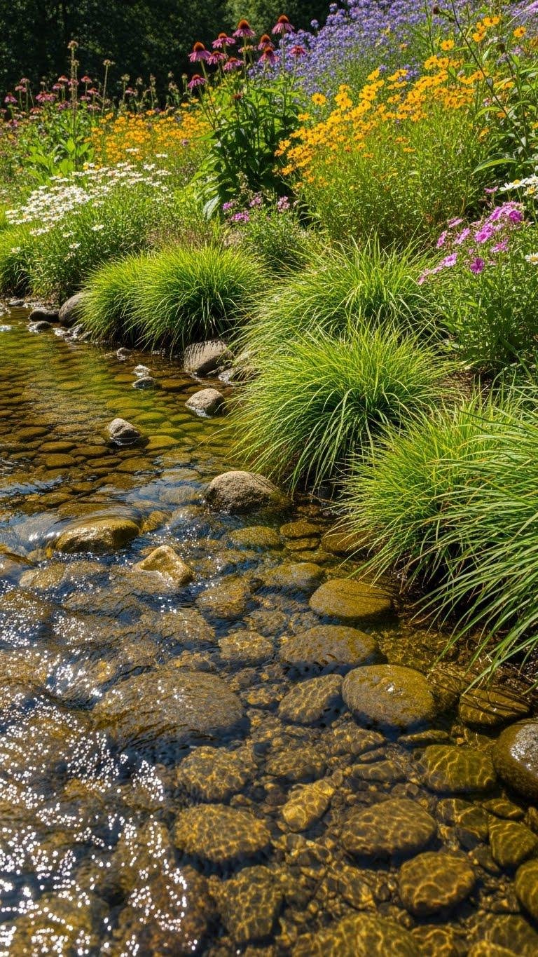 Add streamside planting—sedges, ferns, herbs—for texture and shelter. Maintain flow, access, and simple filtration so the channel feels free and effortless.