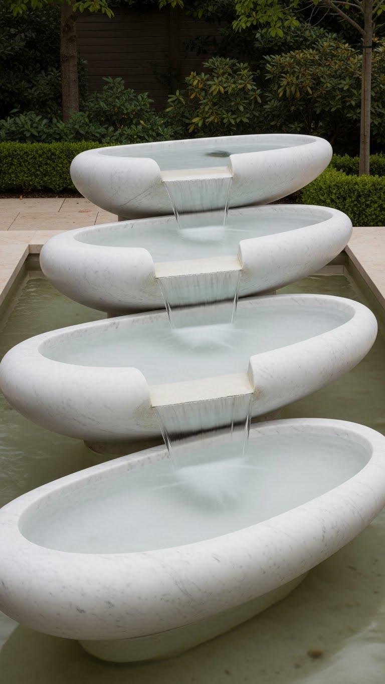 Set on a long, narrow plane, the Three-Tier Carrera Oval Cascade steps water down three smooth, oval basins carved from pale Carrera marble, each rim slightly offset to guide a soft, continuous sheet into the next.